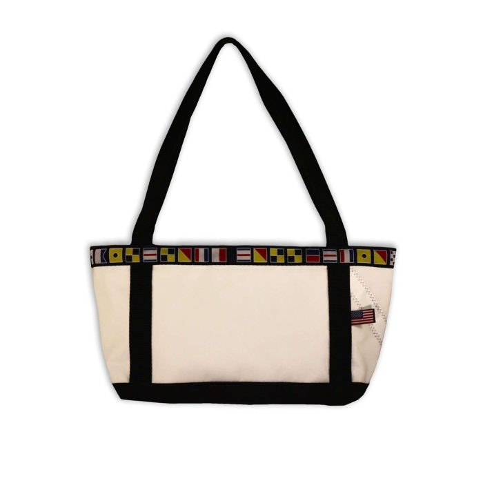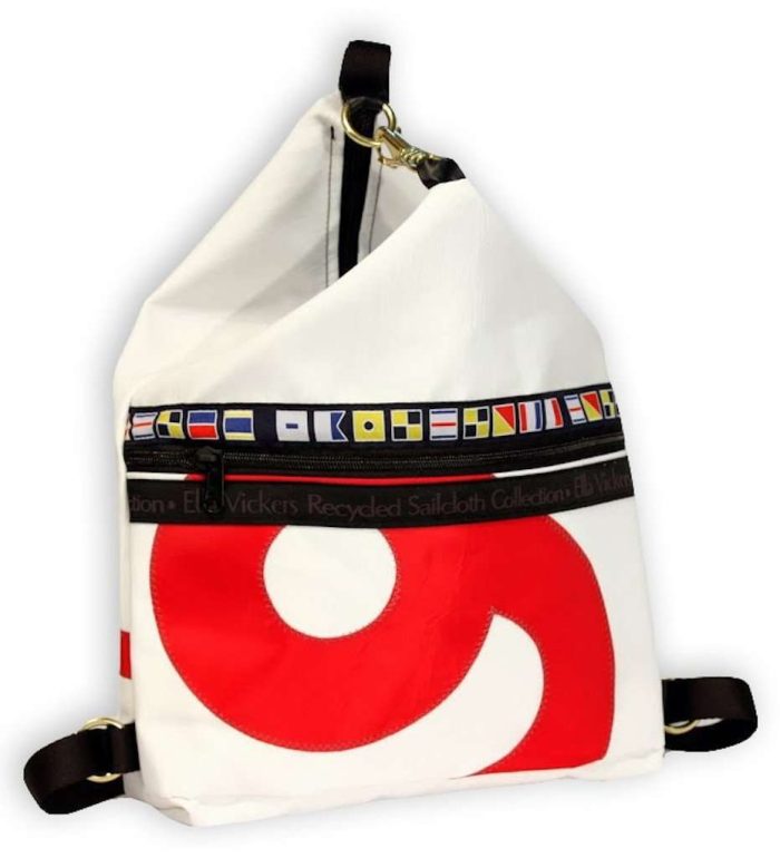 Made in the USA with re-purposed sailcloth from ocean-going yachtsRecycled sailcloth100% recycled webbingInternational code flagsInside zippered pocke