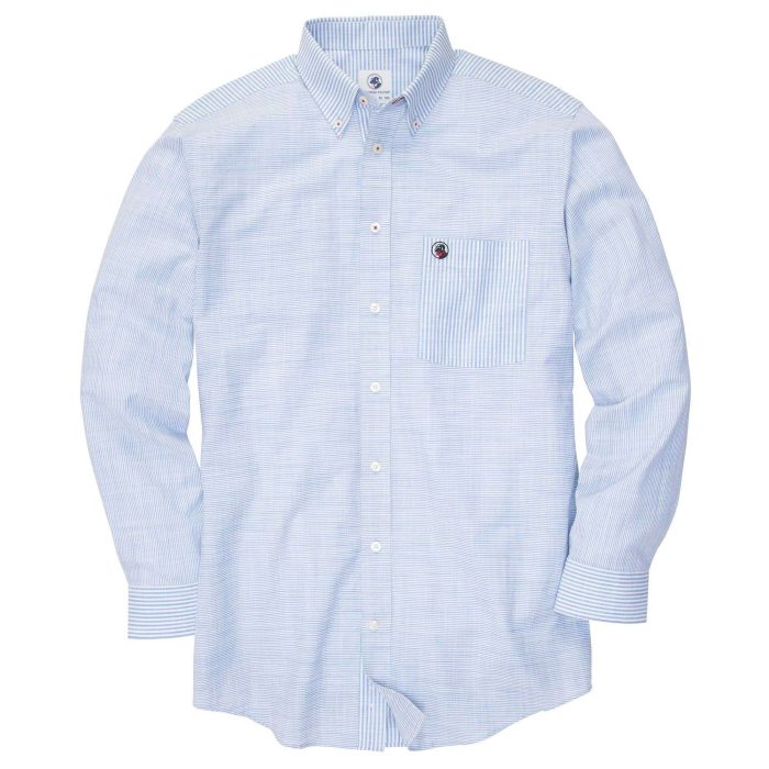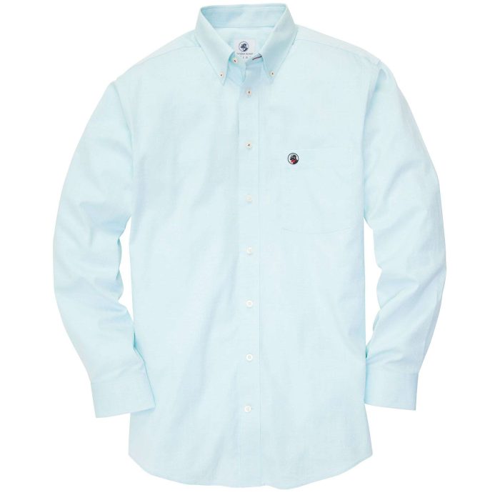 Classic Fit100% CottonButton down collarPocket on left chest with full color Skipjack embroideryLaser engraved buttons with accent color button thread