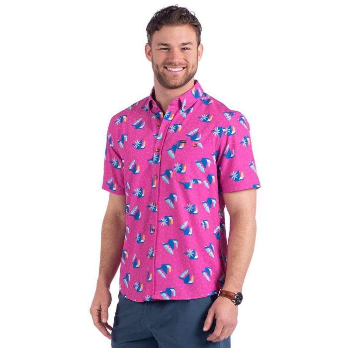 Classic fit100% Cotton madrasButton down collarPocket on left chest with full color Skipjack embroideryLaser engraved buttons with coordinating color