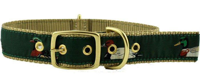 Dog Collar in Green Ribbon on Khaki Canvas with Ducks by Country Club Prep