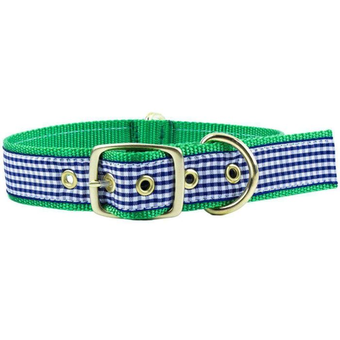 Dog Collar in Navy Gingham Ribbon on Kelly Green Canvas by Country Club Prep