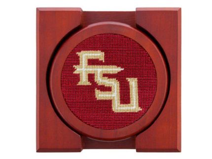 - Packed in sets of 4 - Polished wooden holder - Hand-stitched needlepoint - Handsome and handy - Features 4 coasters featuring the FSU Seminole logo
