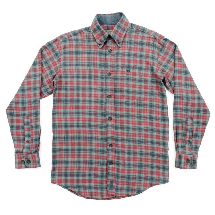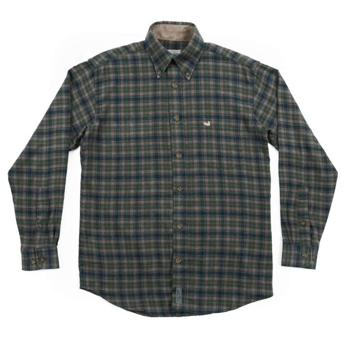 100% Cotton Brushed FlannelButton down pointed collarTwo button cuffCuffs and collar interior contrastCustom patch on exterior placketEmbroidered duck