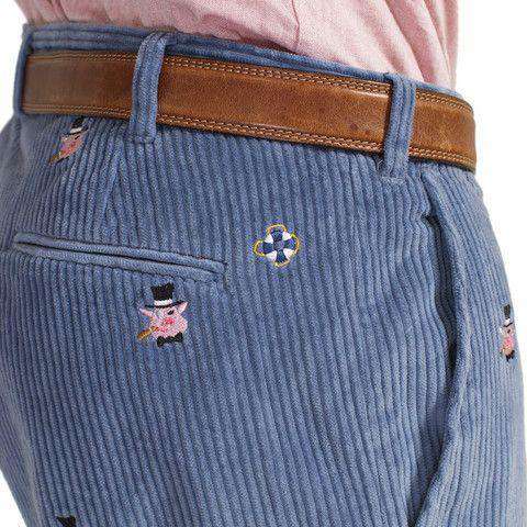 Wide Wale Corduroy Pants in Storm Blue with Capitalistic Pigs by Castaway Clothing