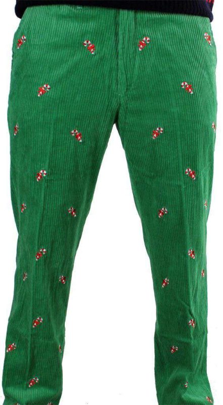 Wide Wale Corduroy Pants in Evergreen with Embroidered Candy Canes by Castaway Clothing