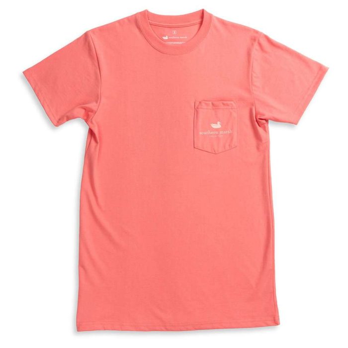 60% Cotton 40% PolyesterPocket TeeFull ColorBenefitsTraditional fitting tee shirtGarment washed for added comfortCustom Southern Marsh designFront poc