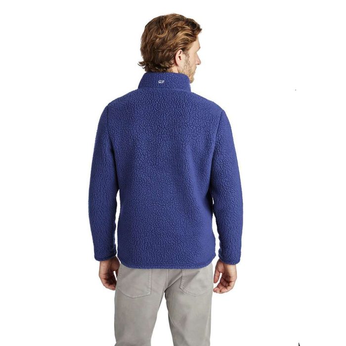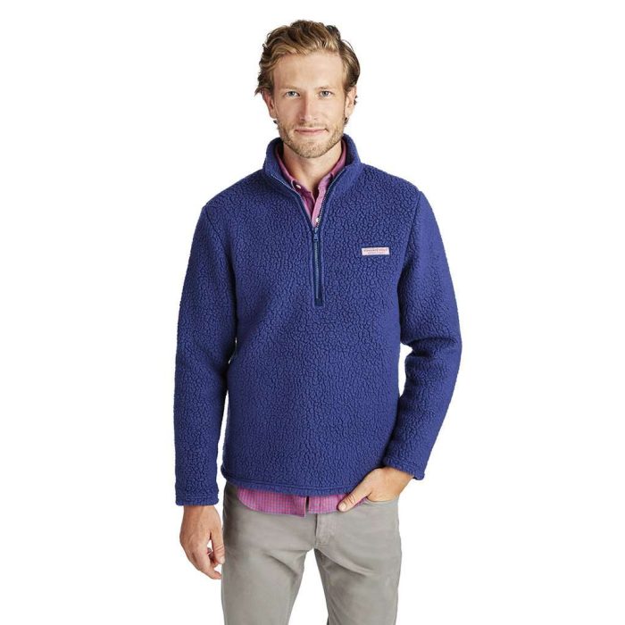 100% polyesterNew Sherpa fabricIncredibly soft to the touchThereās a vineyard vines logo box on the chest ½-zip closureWhale embroidery on the back ne