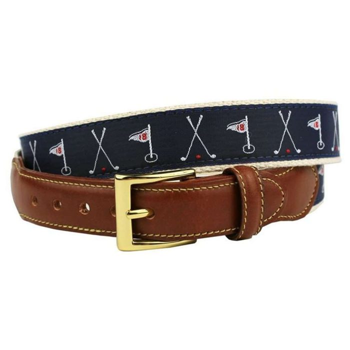 Golf Clubs and Flags Leather Tab Belt in Green by Country Club Prep