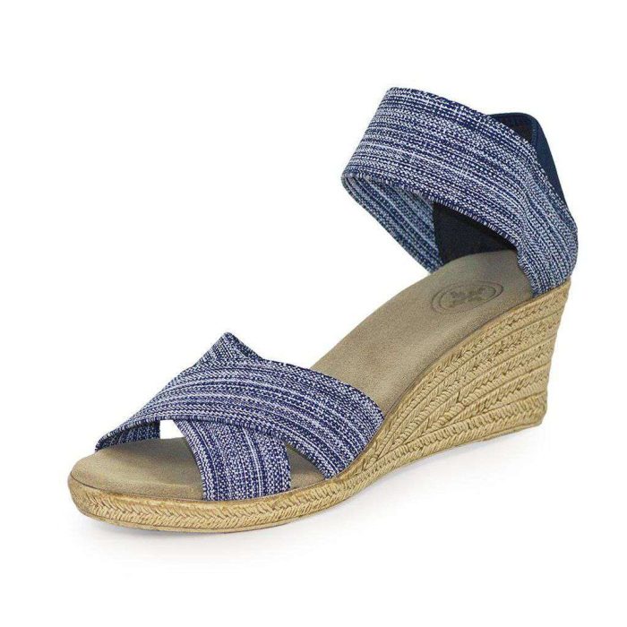 Stretch upper, crisscross strap, wide ankle strap, faux espadrille bottomElastic upperPadded insoleApproximately 2ā³ covered wedge heel**Fit: If you ar