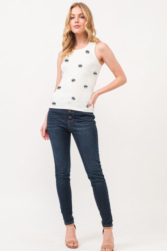 The bat embroidered ribbed tank is a stylish and playful piece perfect for the spooky season! Made from soft, ribbed fabric, it features charming bat