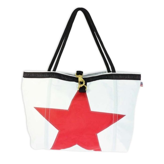 - Made in the USA with repurposed sailcloth from ocean-going yachts - Open tote with brass clip closure - One inside zippered pocket - Inside key clip