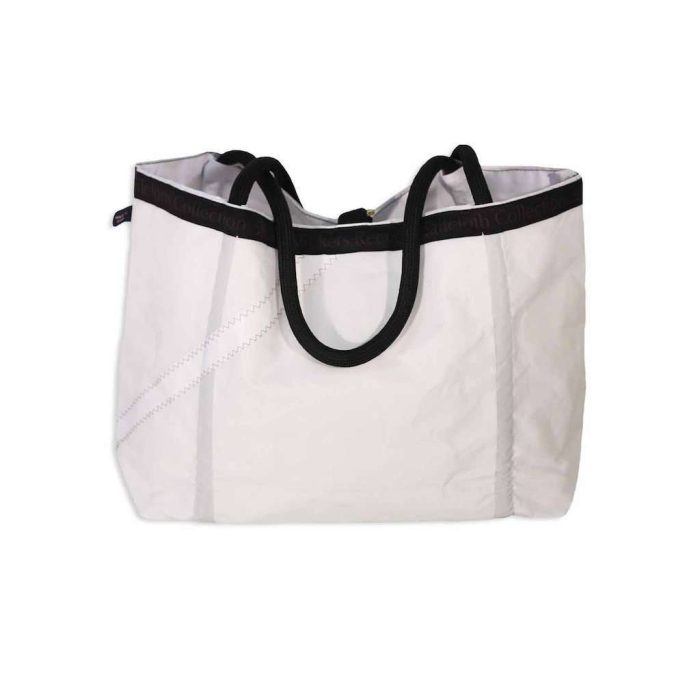 Made in the USA with repurposed sailcloth from ocean-going yachtsOpen tote with brass clip closureOne inside zippered pocketInside key clipWaterproof