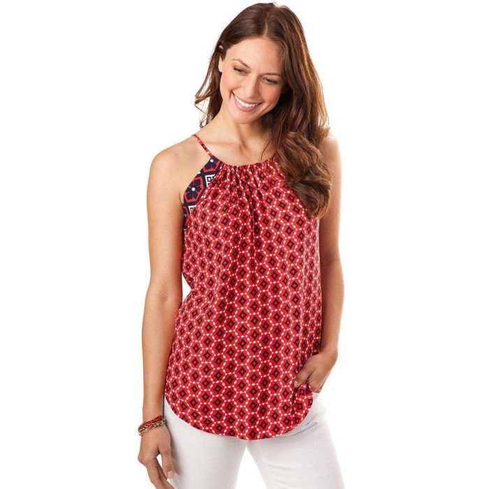 Ruffle front tank with T-back braidedThe fabric is 100% polyesterFabric care: Wash cold and tumble dry on lowModel is 5'6