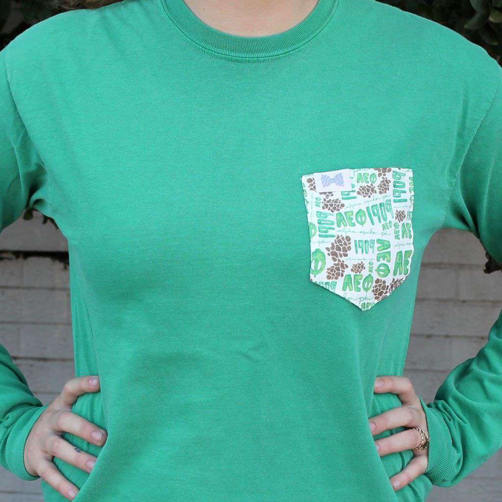 Alpha Epsilon Phi Long Sleeve Tee Shirt in Grass Green with Pattern Pocket by the Frat Collection