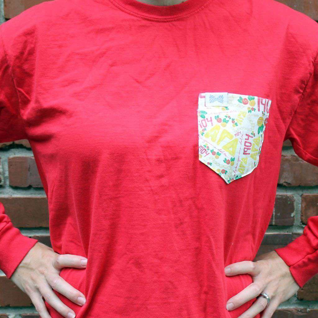 Home Women's Tee Shirts Alpha Gamma Delta Long Sleeve Tee Shirt in Red with Pattern Pocket by the Frat Collection