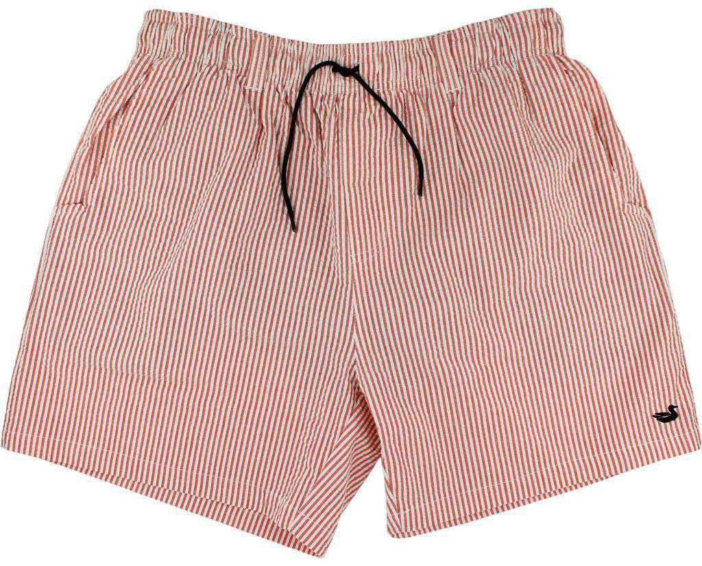 Dockside Swim Trunk in Red Seersucker with Black Duck by Southern Marsh