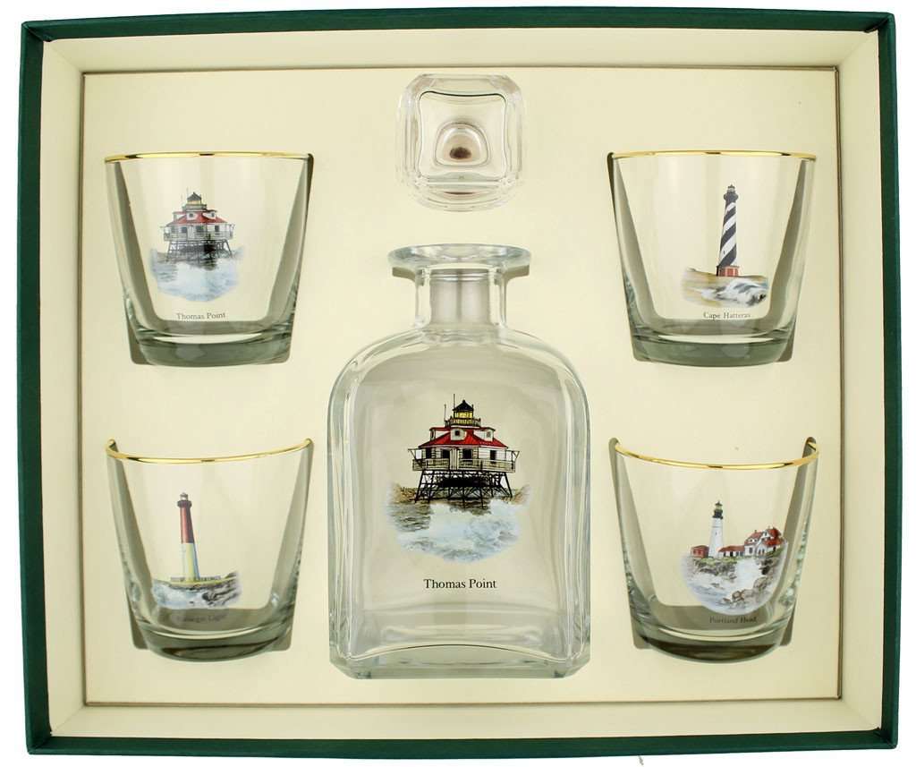 Features lighthouses from Barnigate, Cape Hatteras, Portland Head, and Thomas PointGift boxed4 9oz old fashioned glasses28oz decanter