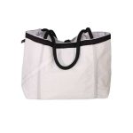 – Made in the USA with repurposed sailcloth from ocean-going yachts – Open tote with brass clip closure – One inside zippered pocket – Inside key clip – Waterproof vinyl liner with sturdy bound seams – Dimensions: 15