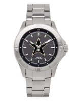 – Brushed stainless steel case and bracelet with high polish edge detail – Coined edge and etched tonal markings – Luminescent hour markers – Hour and minute hands – Rich school color dial with a bold centered logo