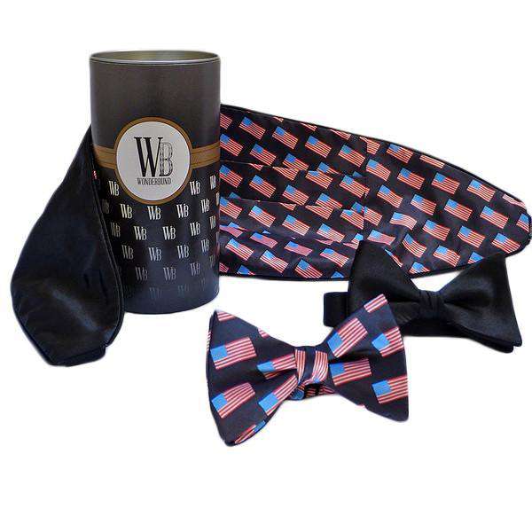 SET INCLUDES: A reversible cummerbund, a luxury black bow tie, and a luxury Flag bow tie all in our WB gold leaf tube.Made from 100% imported satinAdj
