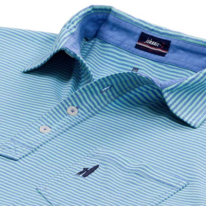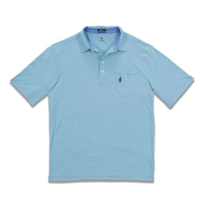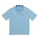 Striped short sleeve polo shirt with signature logo embroidery at chestApproximately 29in from shoulder to hemPointed collarFour-button placketOpen to
